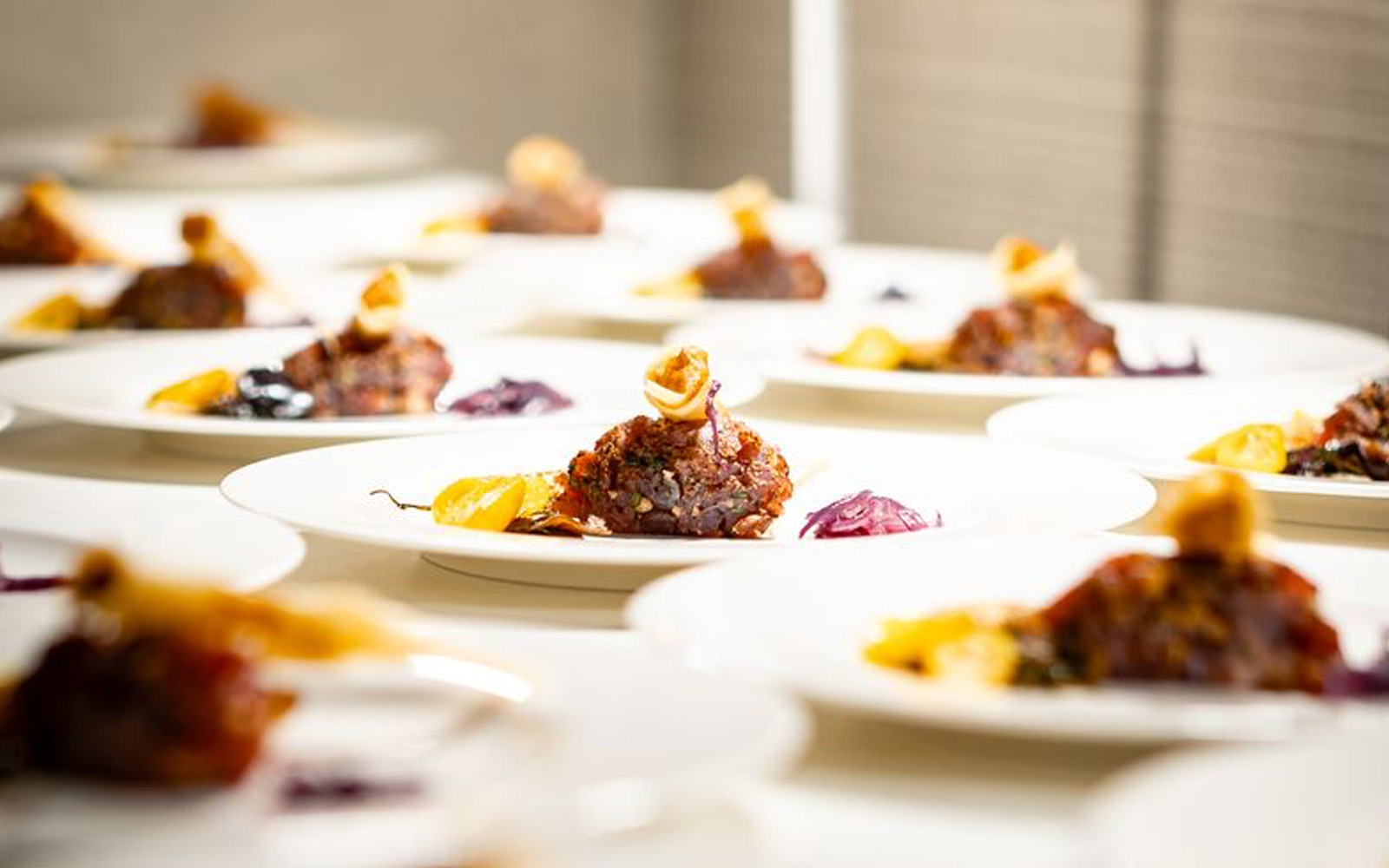 Beispiel für Catering in der EVENTGIESSEREI: elegant angerichtete Speisen auf weißem Teller