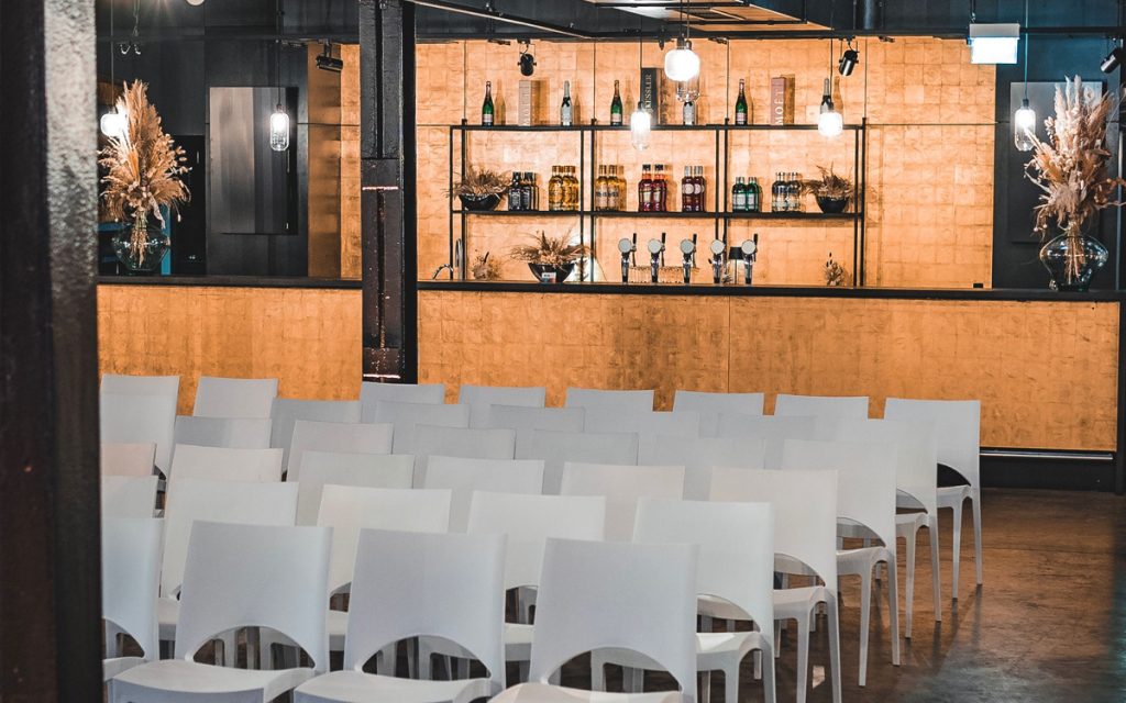 Tagung-Setup in der EVENTGIESSEREI mit weißen Stühlen in Reihen vor kleiner Bühne